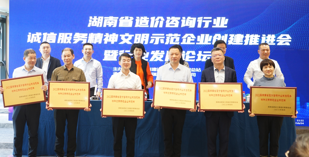 會議最后舉行了2022屆湖南省造價咨詢企業誠信服務精神文明示范企業授牌儀式,表彰在誠信服務和精神文明建設方面表現優秀的企業,鼓勵全行業積極推動誠信服務和精神文明建設。